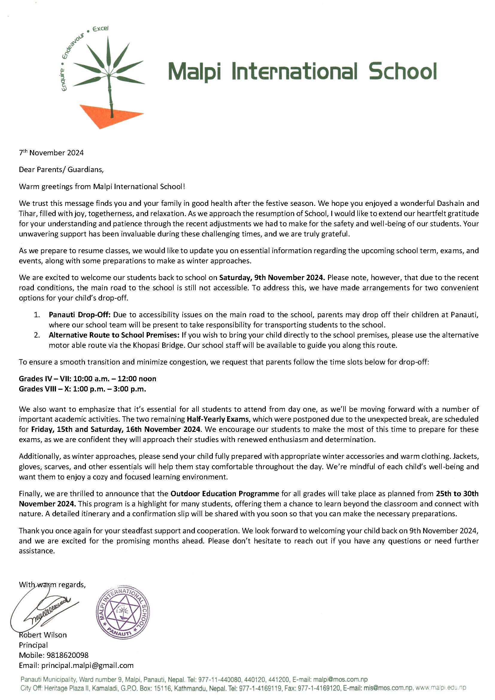 We trust this message finds you and your family in good health after the festive season. We hope you enjoyed a wonderful Dashain and Tihar, filled with joy, togetherness, and relaxation. As we approach the resumption of School, I would like to extend our heartfelt gratitude for your understanding and patience through the recent adjustments we had to make for the safety and well-being of our students. Your unwavering support has been invaluable during these challenging times, and we are truly grateful.