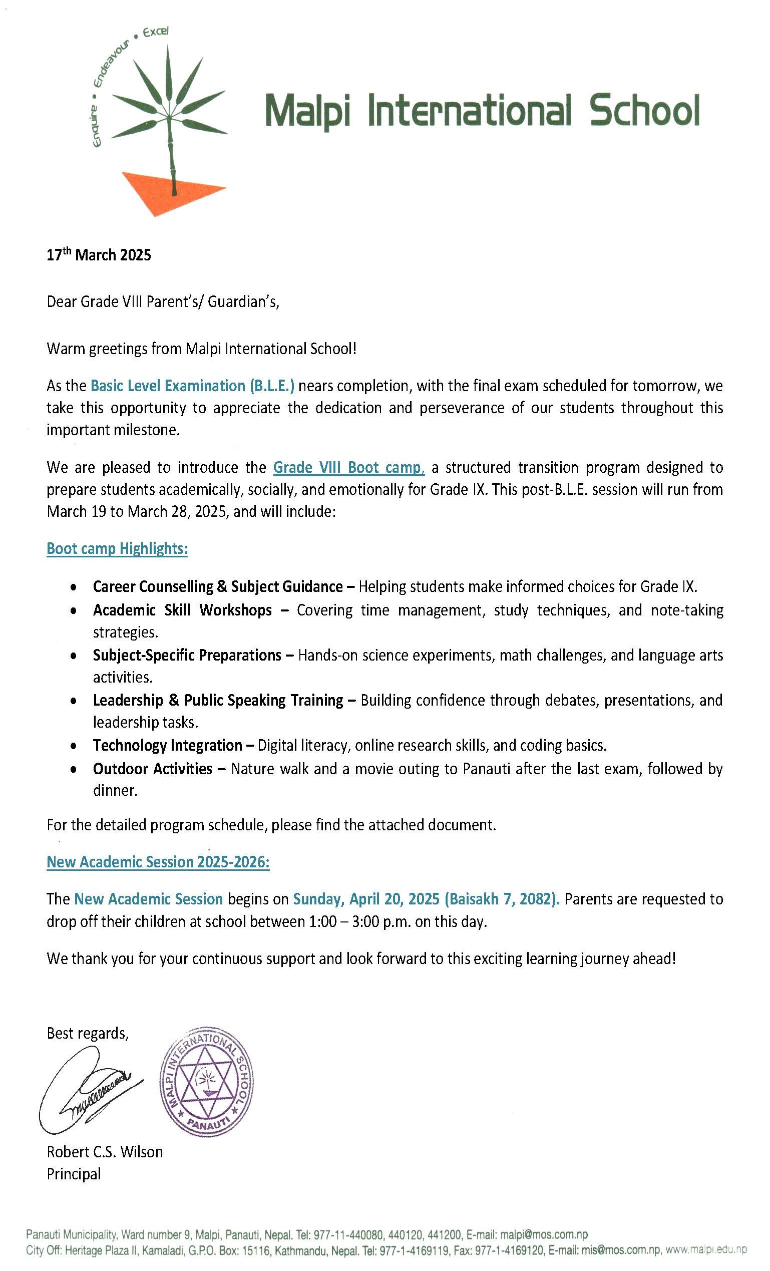 We are pleased to introduce the Grade VIII Boot camp, a structured transition program designed to prepare students academically, socially, and emotionally for Grade IX. This post-B.L.E. session will run from March 19 to March 28, 2025, and will include: