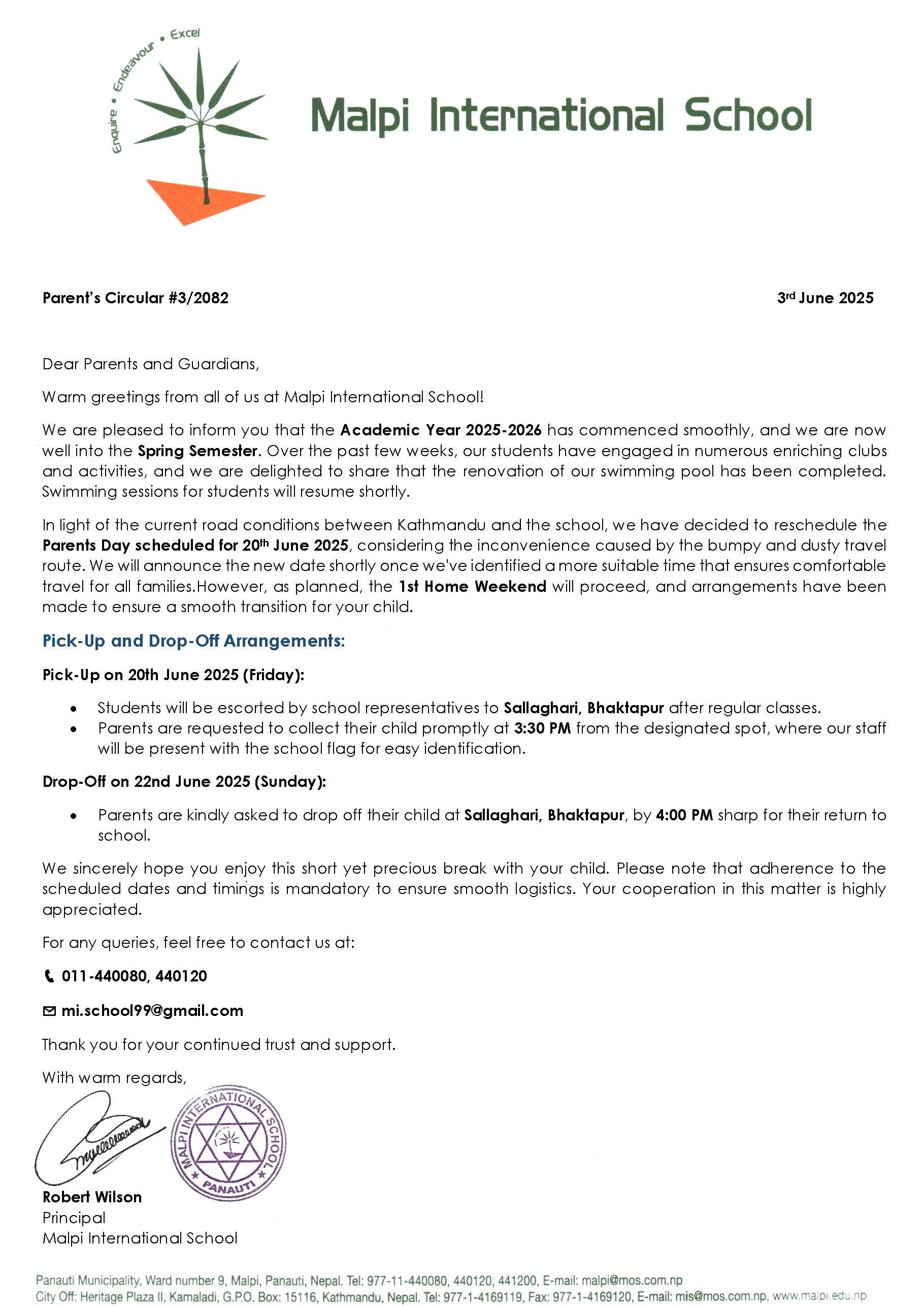 Kindly find enclosed the Notice #03/2082 with regard to the upcoming 1st Home Weekend scheduled for 20th June 2025, attached herewith.